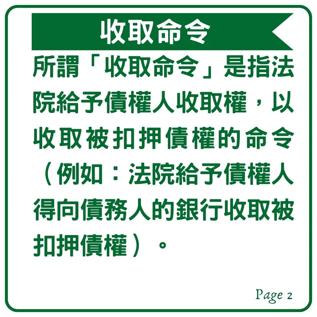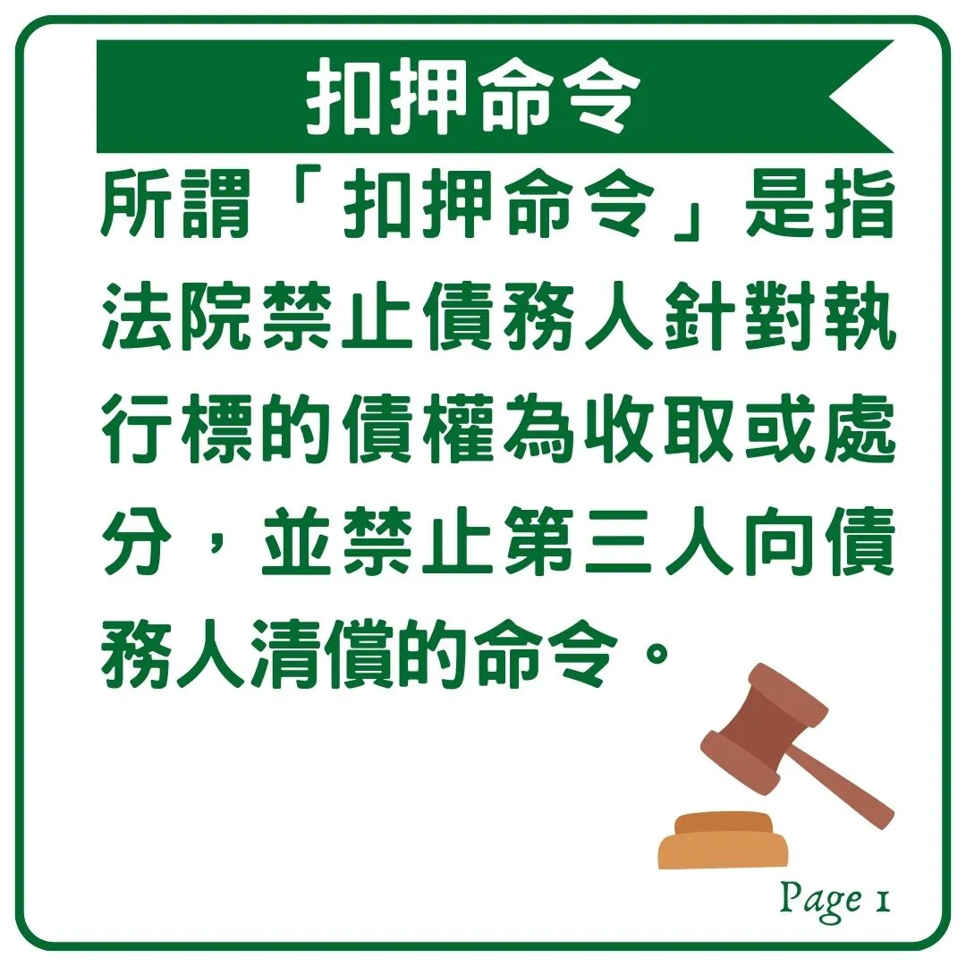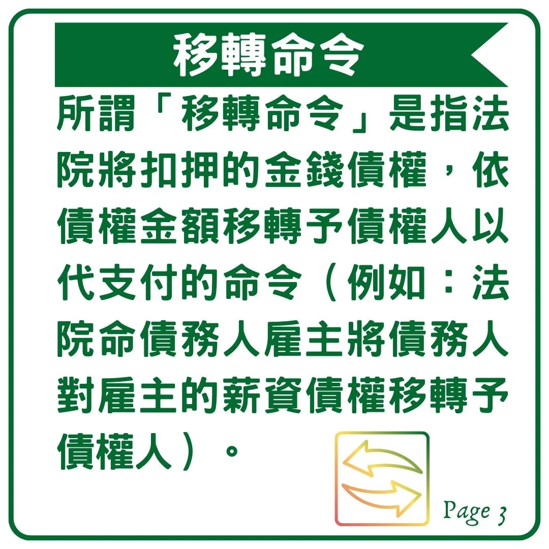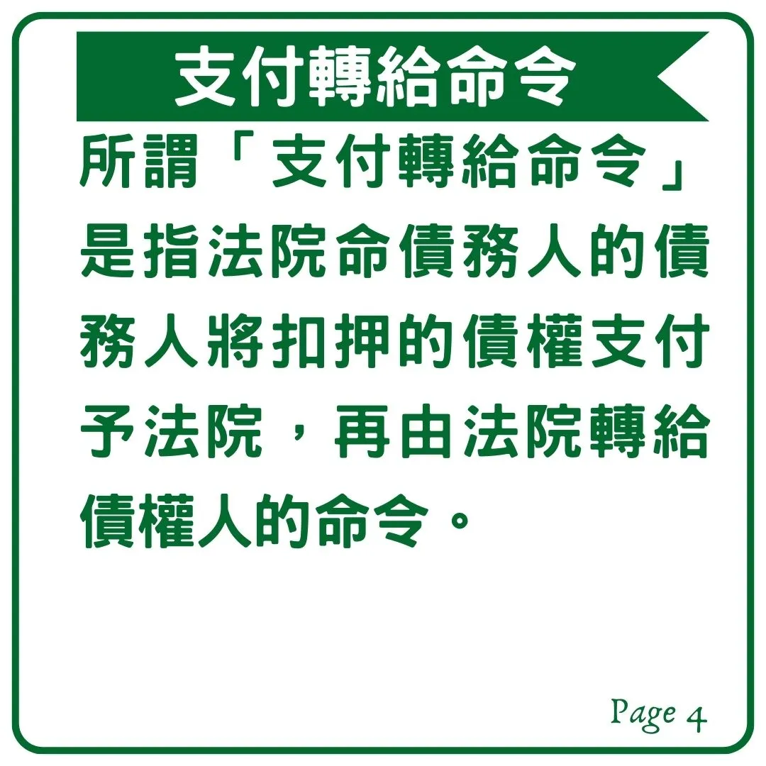 強制執行中執行法院會發的執行命令包含「扣押命令」、「收取命令」、「移轉命令」及「支付轉給命令」,
