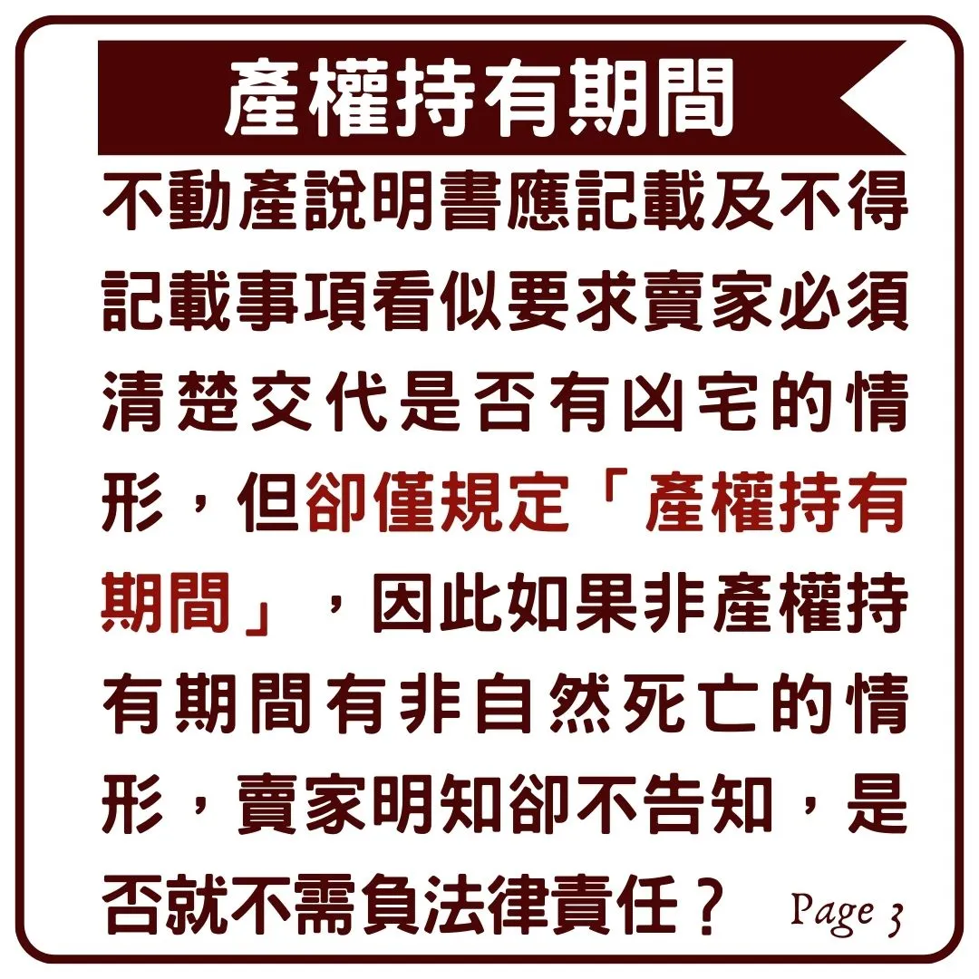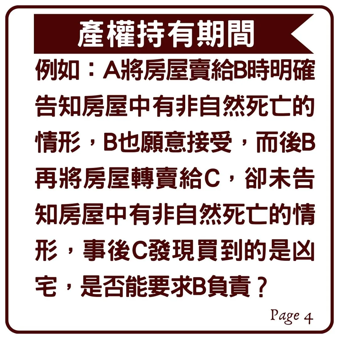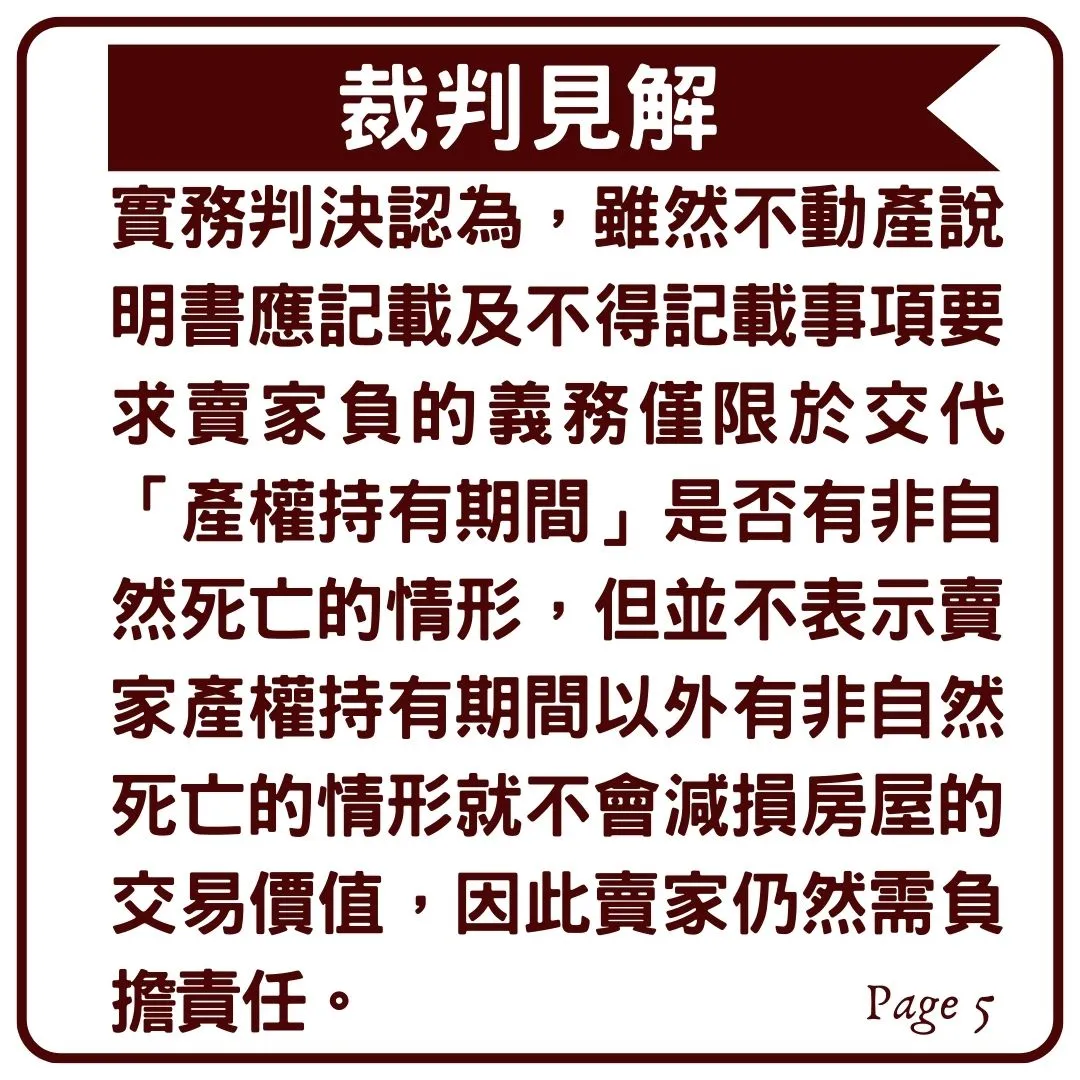 然而賣家卻說:「那是在我上一手屋主持有產權的期間發生的,我產權持有期間並沒有非自然死亡的情形,所以你拿我沒轍!」,