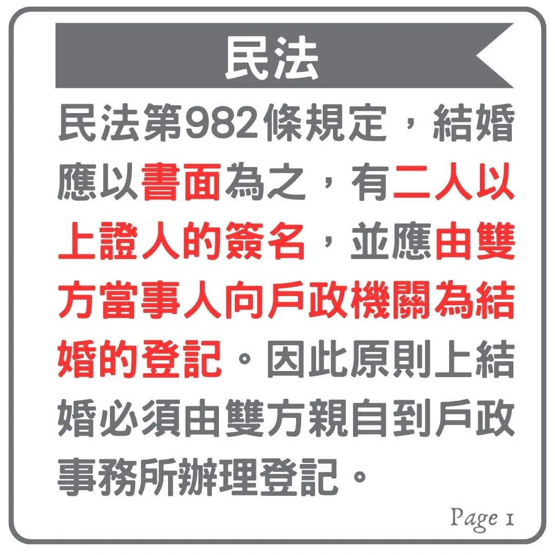 原則上結婚必須要由結婚的雙方當事人一同到戶政事務所辦理結婚登記,